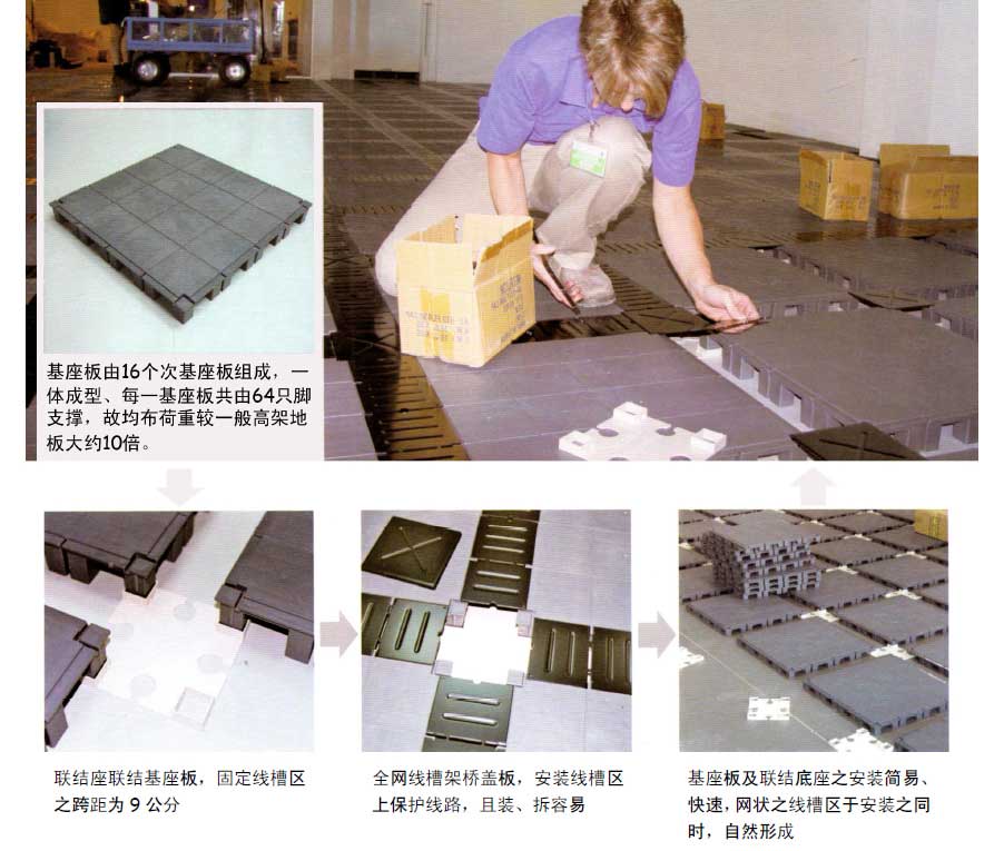 線槽寬度:9公分(90mm)。每一基座板為51公分×51公分,即每60公分中間形成公分寬線槽。每60×60公分內(nèi)有橫向及直向各9公分之線槽區(qū)。